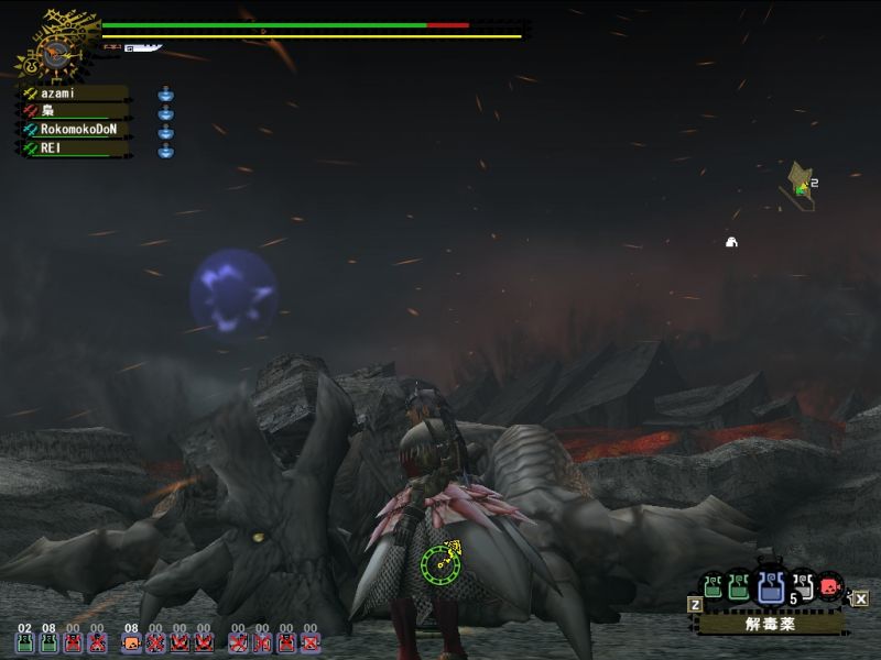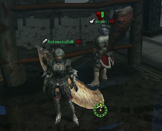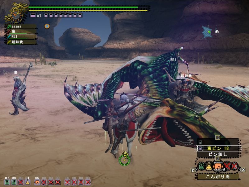 ドスファンゴはシカトしてモスを殴り「苔皮」を一枚GETしたところで、「火竜の翼膜」が後一枚という丼さんのシルバーソル行きの呼び出し。大急ぎでドスファンゴ倒して喜んで街に帰る。