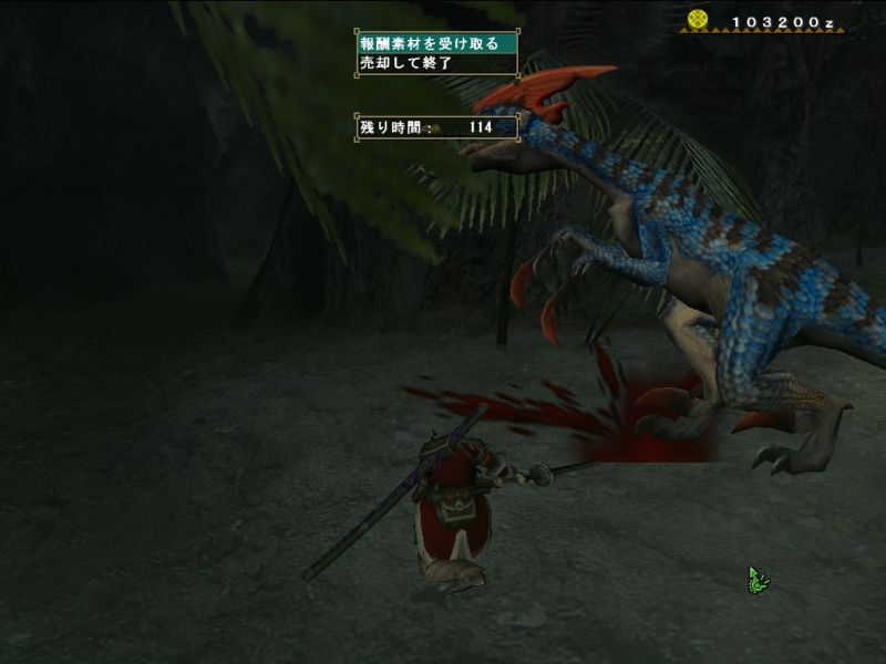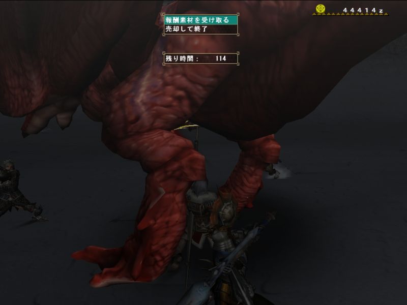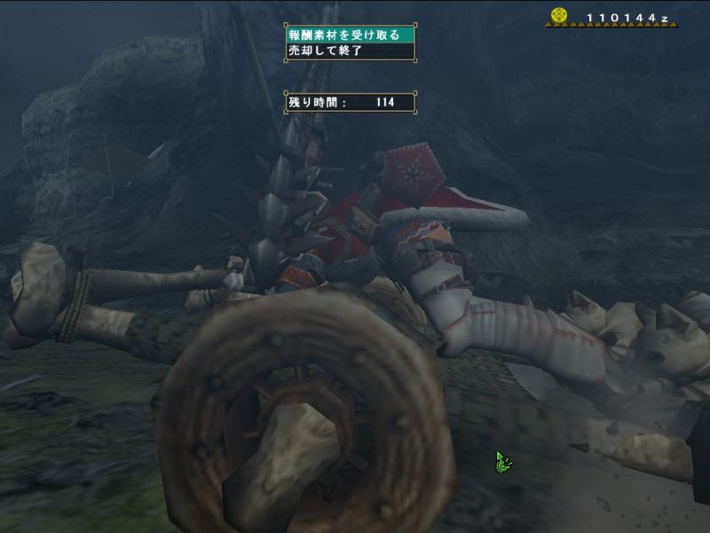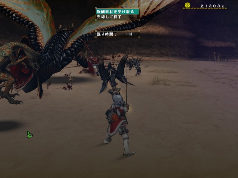 ペイントボールもつけないで、探し回るわ、捕獲には失敗するわの珍道中だ。あげくに討伐間際まわりにうじゃうじゃいたイーオスの毒にやられたところで閃光でピヨって、報酬画面がこのとおり。。。
