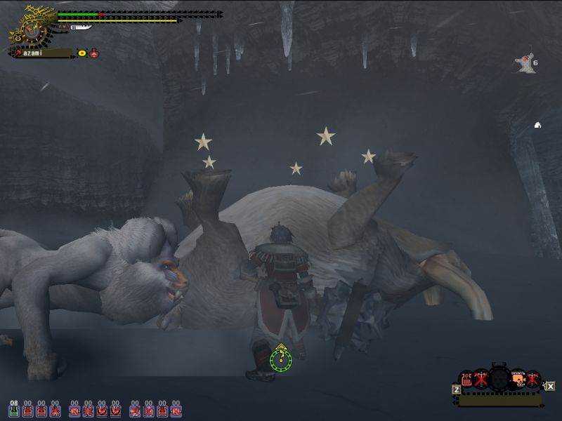近づくとティガと真正面からにらめっこという場面が多くてアセる。体の下から斜めに脇に抜けようとするが足に引っかかるそしてそのあと突進に巻き込まれる; 閃光玉とか持っていったけど投げてる余裕全然なし。