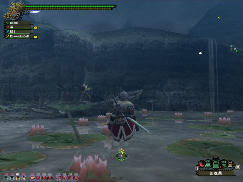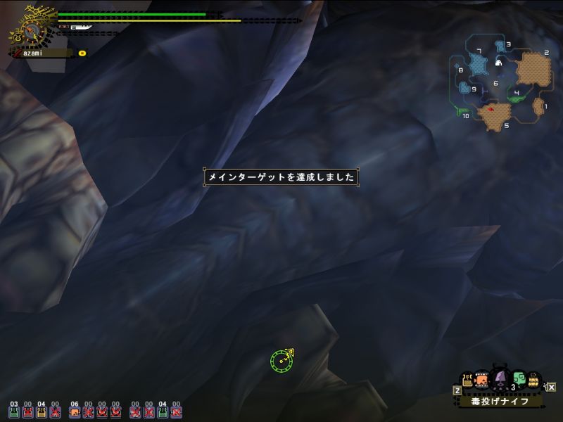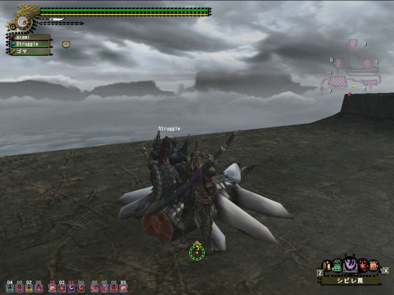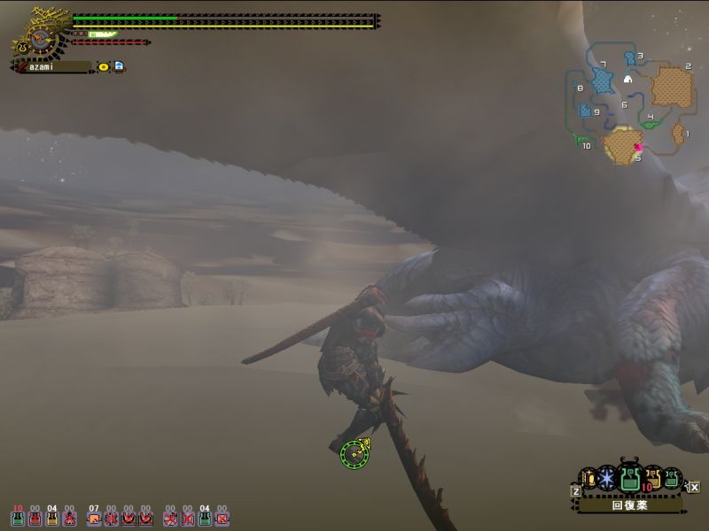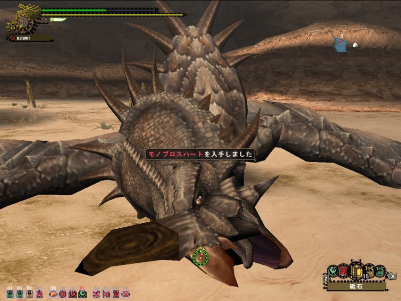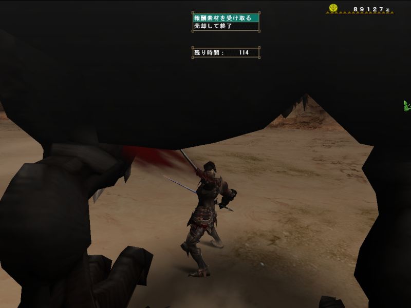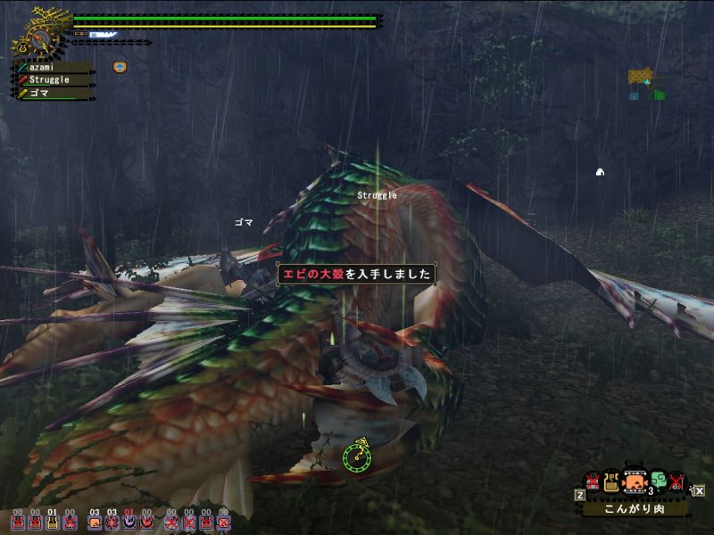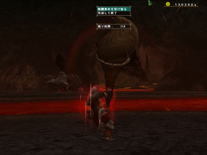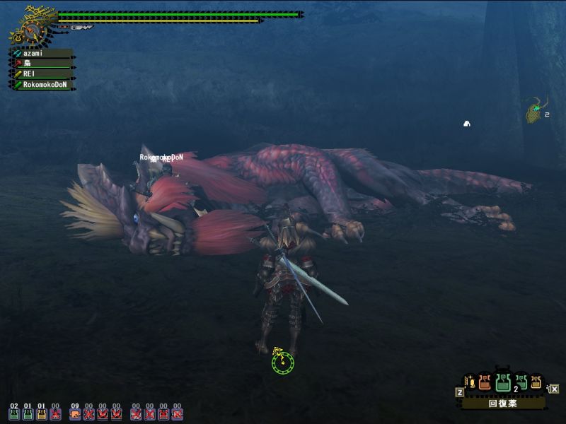 梟さんが太刀で来ていたので動きをよく見ておこうとするが、ティガから逃げるだけでせいいっぱい。。。うまくよけられなくてダメージくらい過ぎ、回復は底をつくわ、用のないときに間違って秘薬は飲むわ、エリア移動時にホストのことは忘れるわ、、、今日はいいところ全然なし。。。(回復を飲んだ回数ならわかる、10+10+粉塵3と秘薬で25だ)